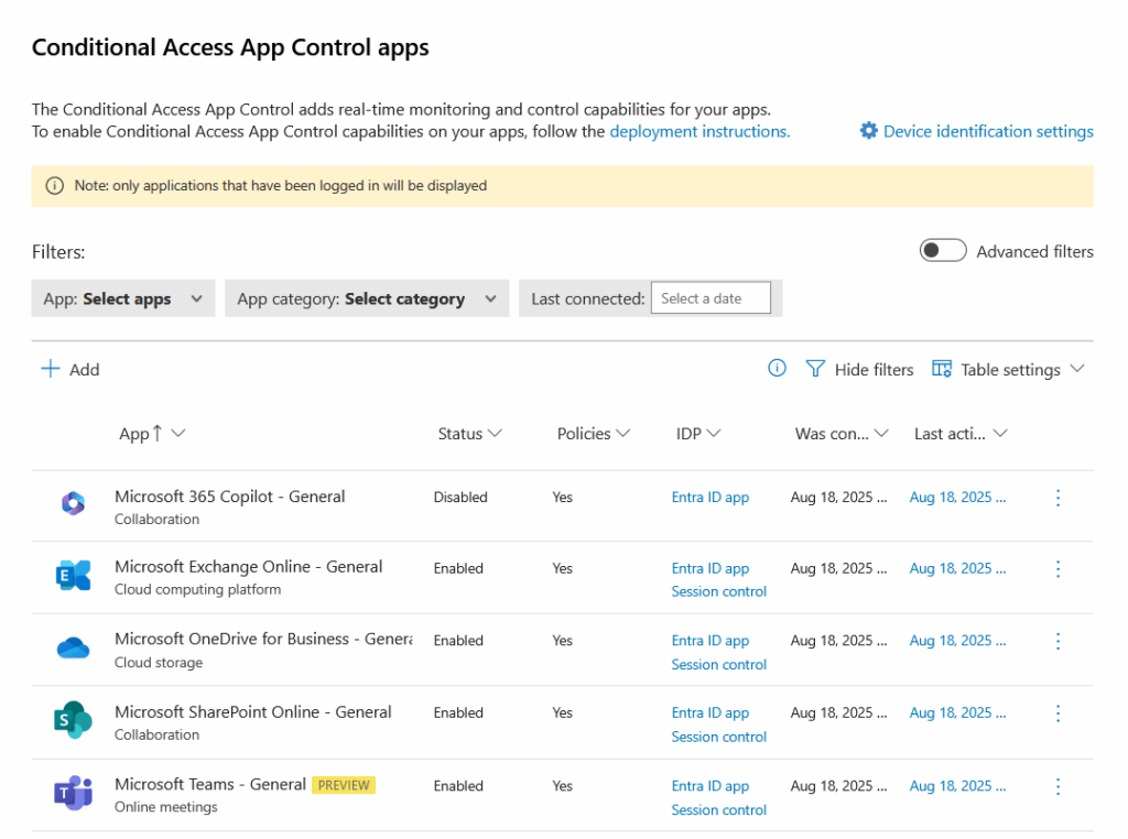 - Connected Apps > Conditional Access App Control apps , Verify apps display Condition access App control